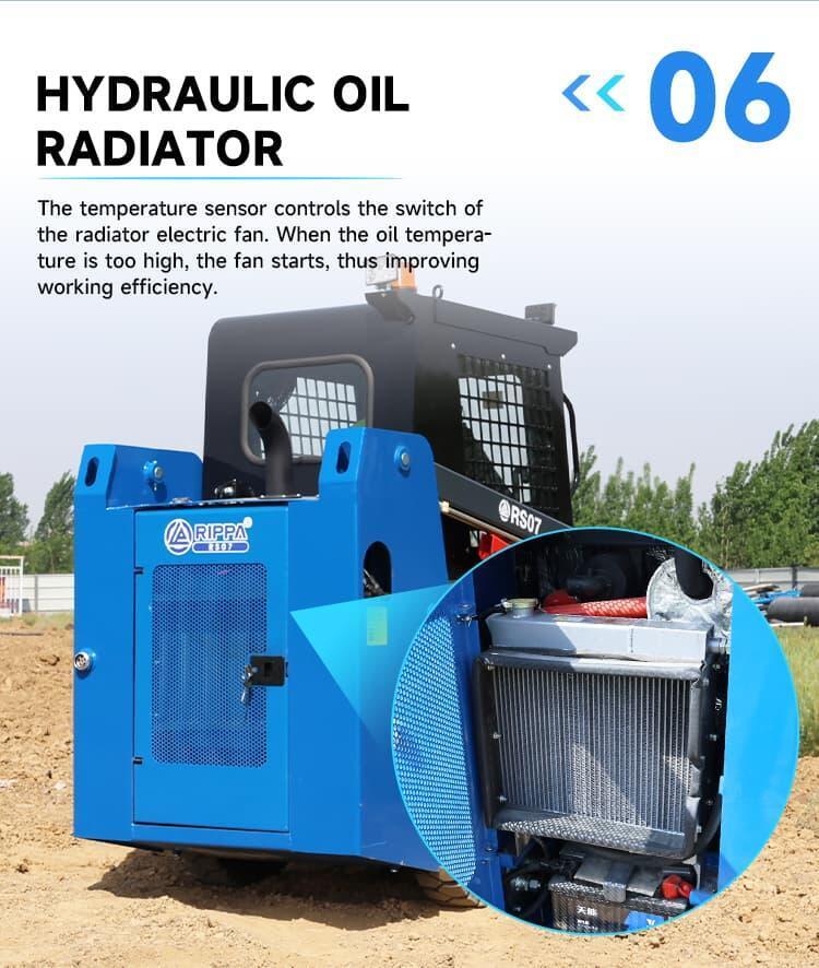 Rippa RS07 skid steer loader adopts high-efficiency engine power and advanced hydraulic system, with stable power output and adaptability to variable working conditions. Whether in urban construction, industrial sites or agriculture scenes, RS07 loader can meet the actual needs of the site with compact structure and super maneuverability. Its multifunctional quick-attach system allows bucket, fork, auger and other attachments to switch quickly, greatly expanding the application boundaries and enhancing customer investment value.