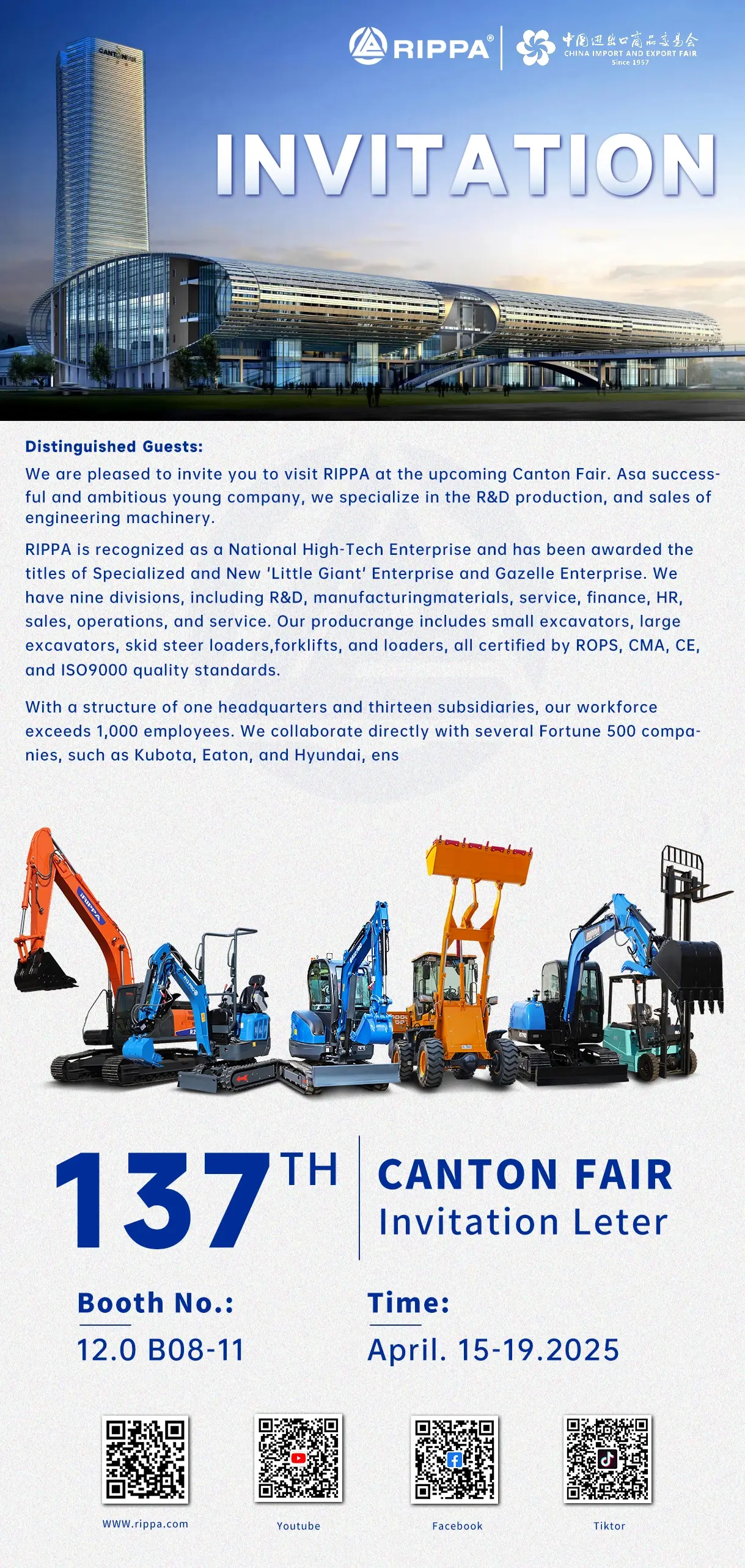 As a leading brand in the construction machinery industry, RIPPA will be in the famous 137th China Import and Export Fair (Canton Fair) from April 15 to 19, 2025. We will meet you at booth B08-11 in Hall 12.0, bringing you a new experience of technological innovation and high-quality products.
