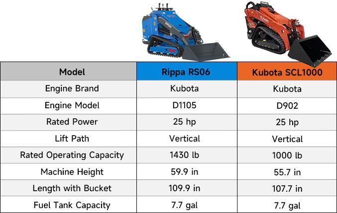 If your priority is heavy lifting, greater efficiency per load, and proven diesel reliability, Rippa RS06 is the smart choice. For users seeking trusted Kubota engineering with slightly more compact dimensions, the SCL1000 is a quality alternative.